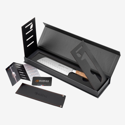 - Un protège lame en cuir végétal, soigneusement conçu pour protéger la lame et préserver sa performance